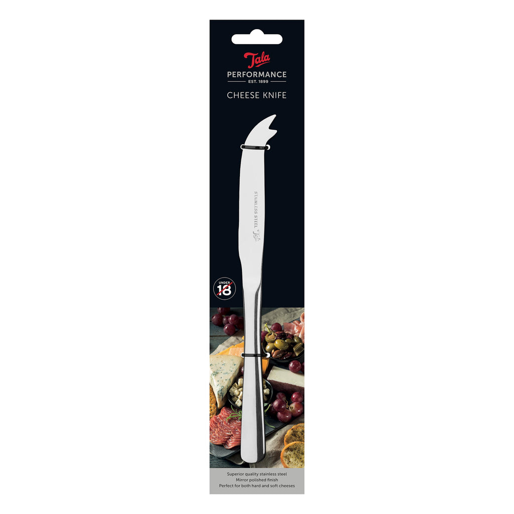Impress your guests with our Tala High Quality Stainless Steel Cheese Knife. The ideal choice for any home for casual dining dinner party or special occasion. Finished with a high-quality mirror polish and discreetly embossed with the Tala logo our weighted cutlery will impress. Includes classic shape Cheese Knife with serrated edge and pronged top for picking up cheese. The perfect addition to any cutlery collection. Includes single Cheese Knife. Dishwasher Safe.