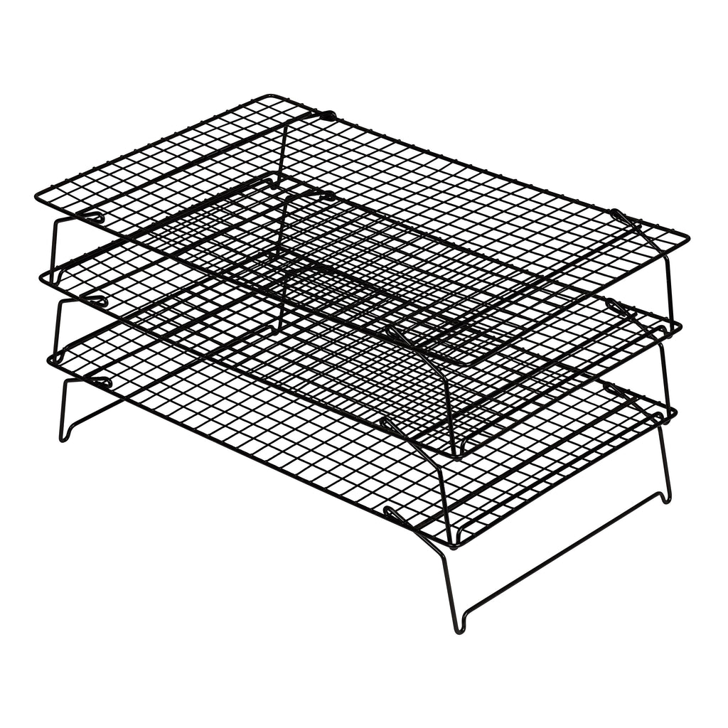 Our space-saving Tala 3-Tier Non-Stick Cooling Rack is ideal for keeping cakes muffins and biscuits raised off the worktop while they cool. Our cooling tray allows steam to evaporate from all surfaces cooling cakes faster. Cover with greaseproof paper to avoid damage when cooling fragile cakes. The cooling tray is chrome plated which is made to a traditional design and style. Oven safe to 280 degrees.